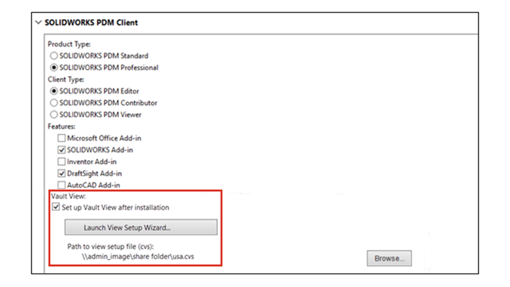 You can now include a SOLIDWORKS PDM view setup file in the admin image. This feature eliminates the extra effort needed to help a user create a vault view after installation.