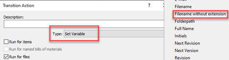 SOLIDWORKS has made the “Set Variable” action the default selection in the Type list to improve a user’s workflow. Set Variable allows administrators to configure workflows more efficiently. The built-in system variable value “Filename without extension” is now available for the Set Variable transition action. This system variable will enable you to update a Number variable value with the file’s name.