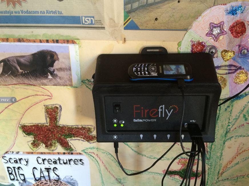 The controller for a Firefly solar-powered lighting system installed on a wall in Tanzania.