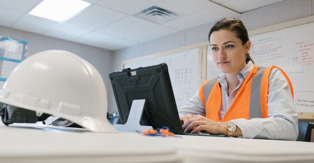 A female construction worker on a computer