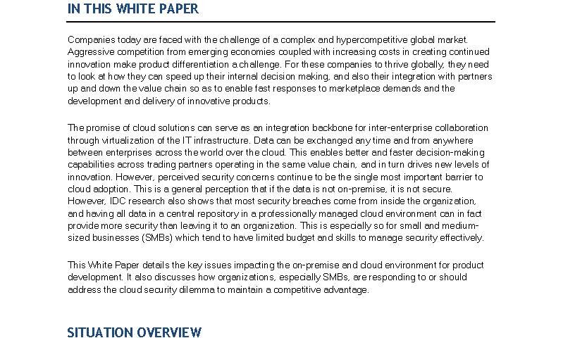 This White Paper details the key issues impacting the on-premise and cloud environment for product development. It also discusses how organizations, especially SMBs, are responding to or should address the cloud security dilemma to maintain a competitive advantage.