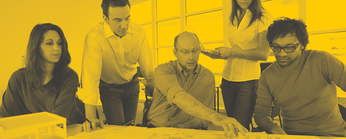 A team of architects reviewing architecture plans on a desk in an office.