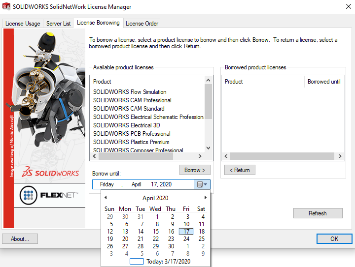 To check out a license, users will launch the SolidNetwork License Manager Client and go to the License Borrowing tab.  Select your date first, then CTRL select your products and click Borrow.  You may return the licenses early as long as you are connected to the network.