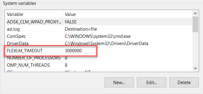The recommended variable for FLEXLM_TIMEOUT is 3,000,000. The variable tells the Autodesk application to wait 3 seconds for a response from the FLEXLM server. The value can be edited for higher latency issues.