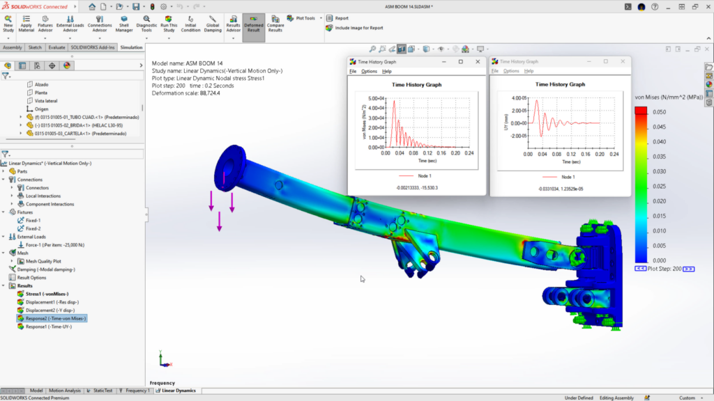 And it doesn’t stop there. Static stress analysis is only one part of a comprehensive validation process. Resonant vibrations, for instance, can threaten the integrity of welded areas or bring mechanical systems to catastrophic failure. SOLIDWORKS Simulation’s frequency analysis and linear dynamic studies allow you to predict and avoid these risks by visualizing transient stresses, displacements, and dynamic responses over time.